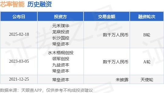 证券之星消息,根据天眼查APP于2月18日公布的信息整理,芯率智能科技(苏州)有限公司B轮融资,融资额数千万人民币,参与投资的机构包括元禾璞华,龙鼎投资,长沙国控,常垒资本。